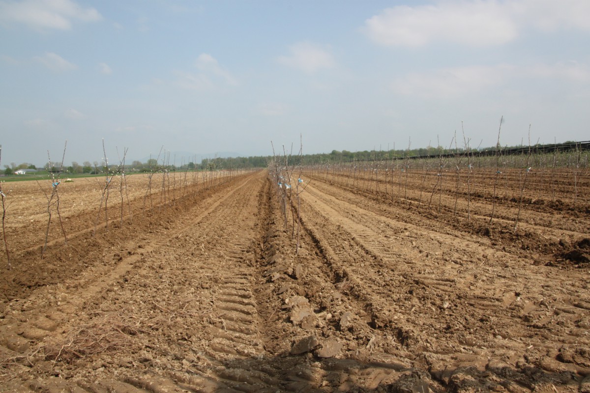 Mitte August beginnt der Zyklus unserer Erdbeerkulturen. Das Feld wird mit Pflug und Kreiselegge vorbereitet, damit eine aufgelockerte, krümelige Bodenstruktur für die folgenden Arbeitsschritte entsteht. Gleich im Anschluss werden vom Lohnunternehmer die Dämme geformt und mit Schwarzfolie überzogen. Der Traktor für diesen Arbeitsschritt ist mit GPS ausgestattet, sodass die Dämme immer geradlinig sind und den gleichen Abstand zueinander haben. Die Schwarzfolie dient in erster Linie der Unkrautunterdrückung neben den Erdbeerpflanzen. Dies ermöglicht eine hohe Einsparung von Herbiziden. Gleichzeitig wärmt die Schwarzfolie die Erde früher auf und die Erdbeeren haben einen Vegetationsvorsprung. Nachdem die Folie gelegt ist werden wurzelnackte Erdbeerpflanzen auf dem Damm gepflanzt. Dieser Arbeitsschritt erfolgt von Hand, indem mit einem Eisen die Wurzel in den Boden gedrückt wird, bis das Rhizom (Wurzelhals) noch aus der Erde herausschaut. Nach der Pflanzung bedarf es regelmäßiger Bewässerung, insofern es nicht regnet. Die nackten Wurzeln müssen zur Wasser- und Nährstoffaufnahme zunächst den Bodenschluss herstellen, bis dahin besteht die Gefahr des Austrocknens.