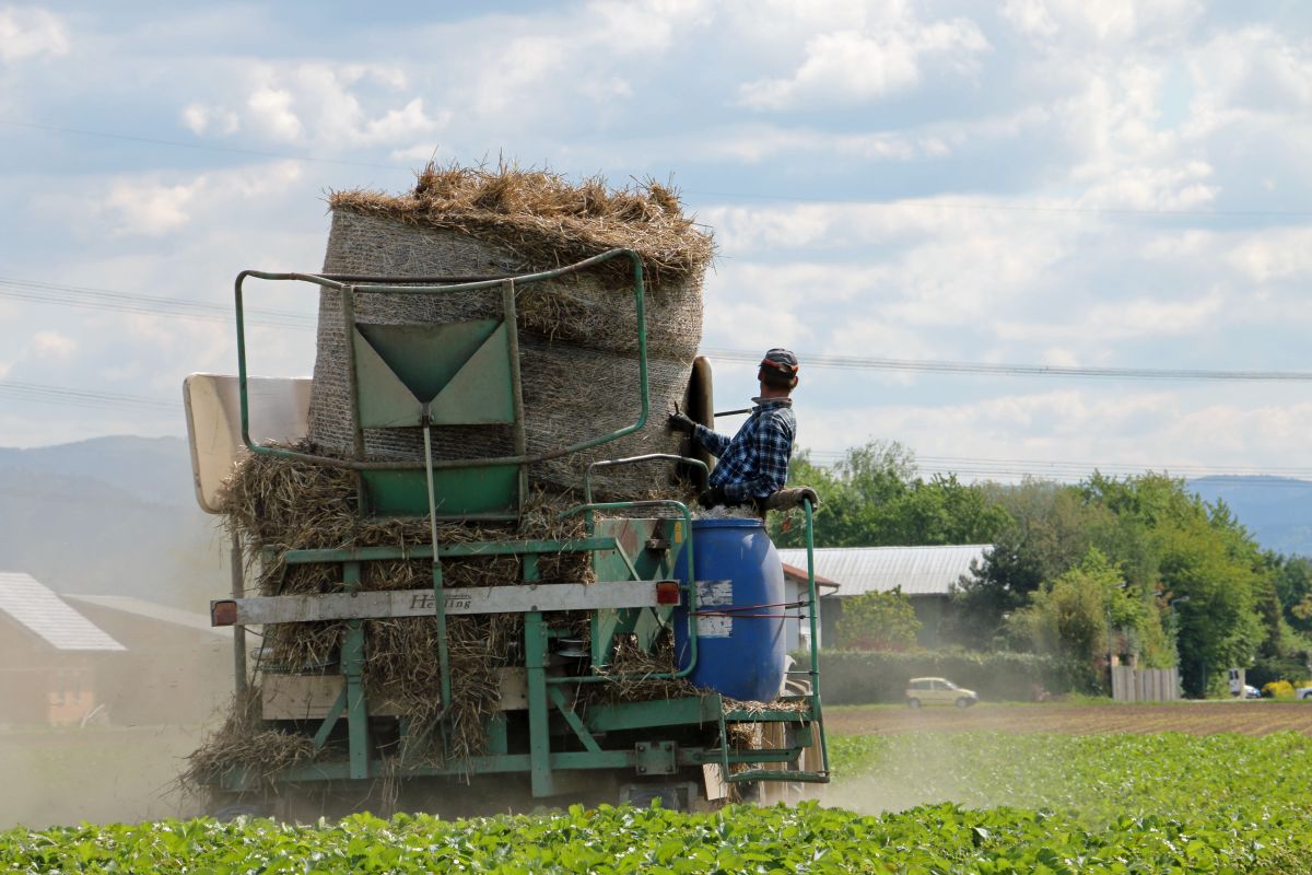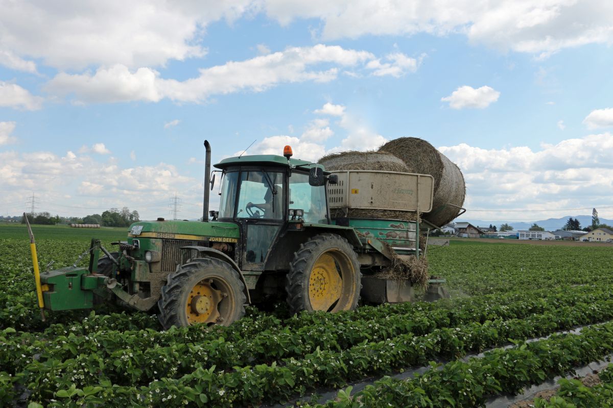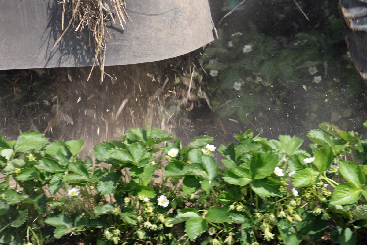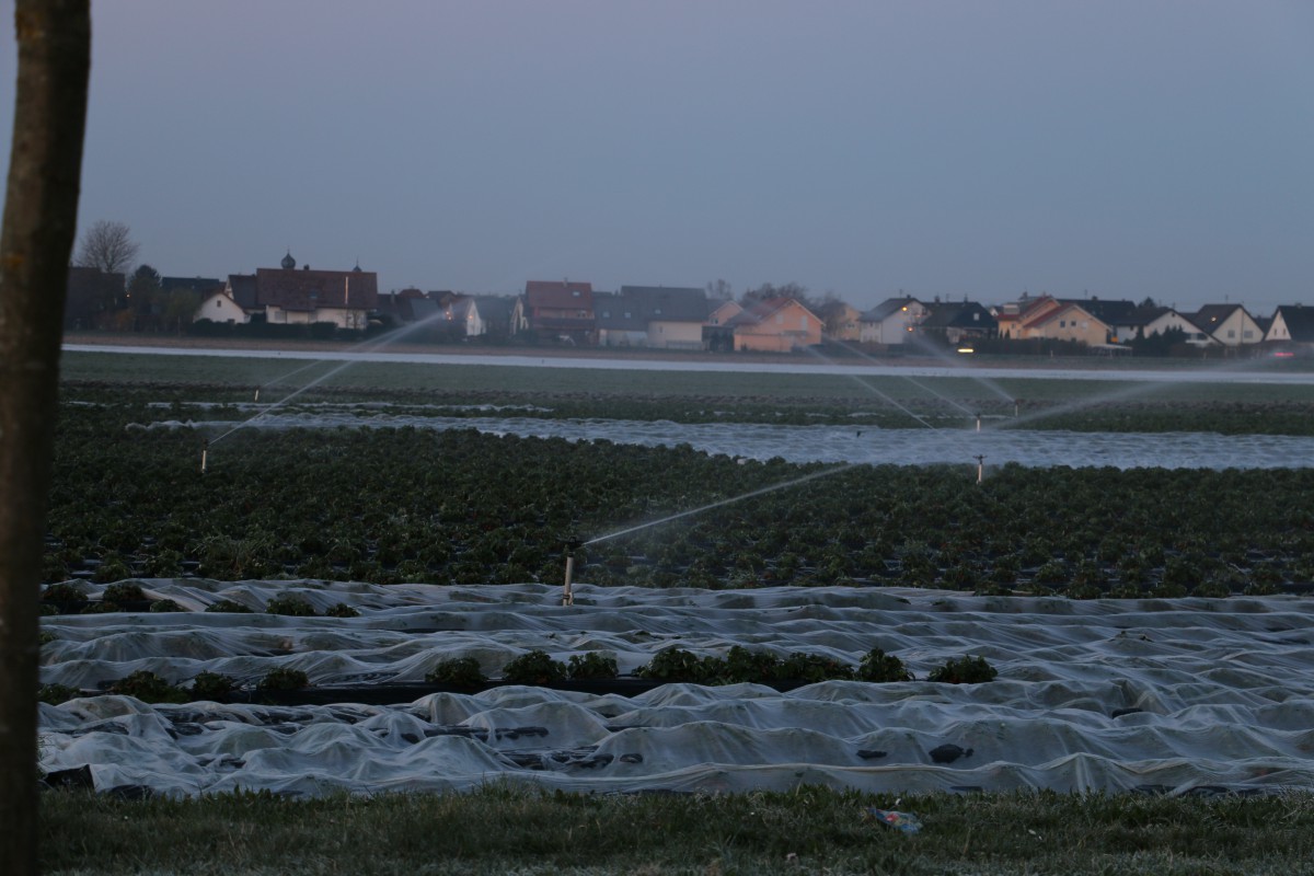 Kurz vor der Ernte wird Stroh zwischen die Reihen gehäckselt. Dies dient einer „sauberen“ Ernte, damit die Früchte nicht mit der Erde in Kontakt kommen. Das ist die ursprüngliche Methode, wie Erdbeeren unterlegt werden, wie die englische Übersetzung strawberry (Strohbeere) verdeutlicht. Durch das eingelegte Stroh kann die Bodenwärme nicht mehr so leicht aufsteigen, da es wie eine Dämmung wirkt. Deshalb steigt bei Spätfrösten die Gefahr, dass Blüten erfrieren. Hierbei bedienen wir uns der sogenannten Frostberegnung. Die Pflanzen werden ständig mit Wasser benetzt, welches anfriert. Durch den Gefrierprozess entsteht gleichzeitig Energie in Form von Wärme, die nach innen zur Blüte/Erdbeere abgegeben wird und diese vor dem Erfrieren schützt. Damit können bis ca. –4 °C überbrückt werden. Im Jahr 2014 waren wir am Frostberegnen, als wir plötzlich einen unerwarteten Besuch der Polizei bekamen. Wir wurden für Diebe gehalten und mussten unseren nächtlichen Einsatz erklären. Nach kurzem Verwundern haben wir uns letztendlich gefreut, dass wir aufmerksame Menschen um uns herum haben.