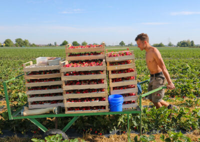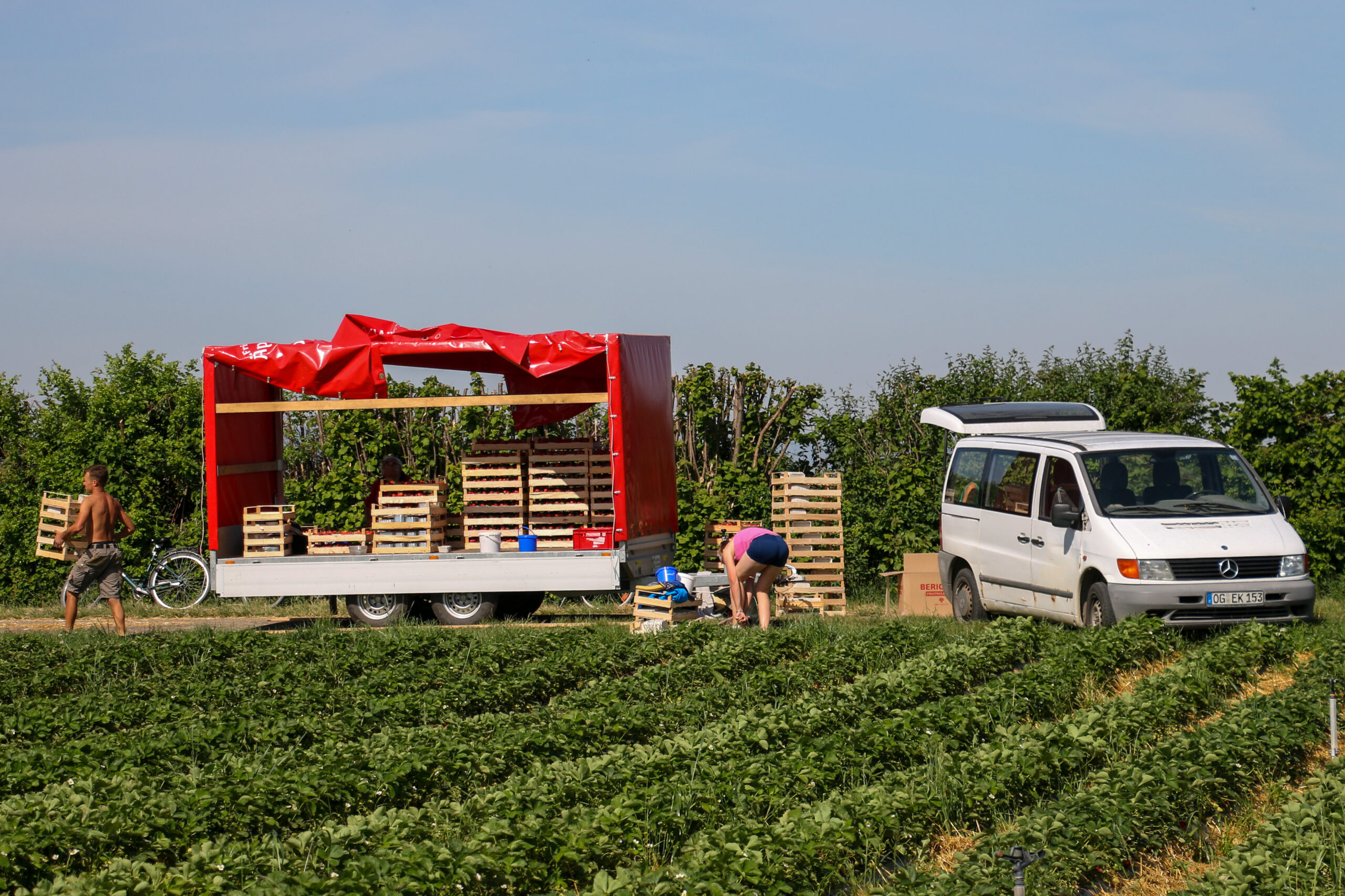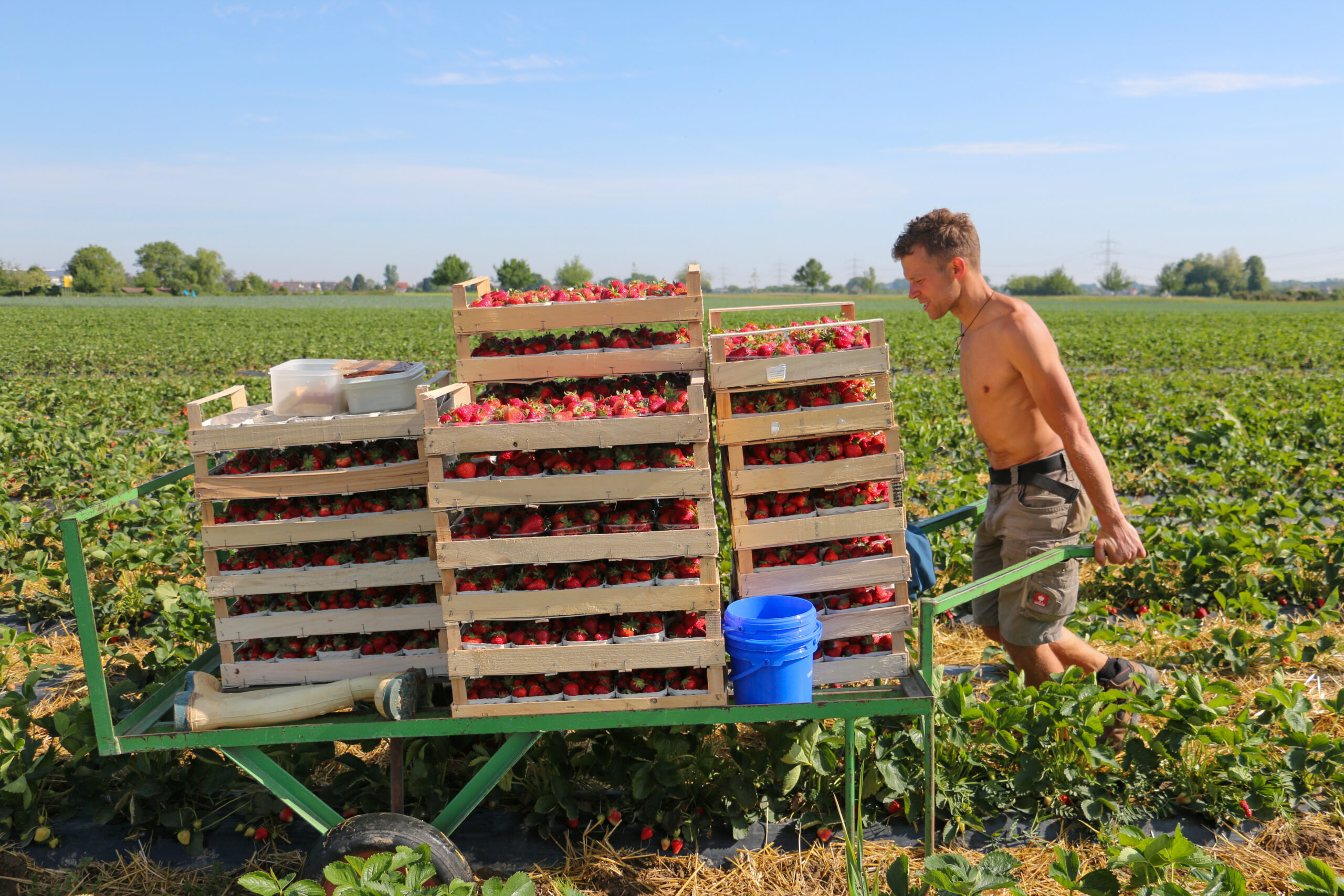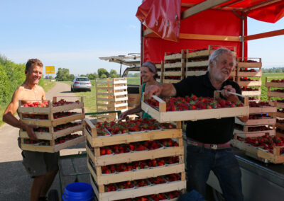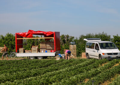 Anfang Mai beginnen wir im Normalfall mit der Erdbeerernte. Dank unserer polnischen Erntehelfer können wir die Früchte mit dem bestmöglichen Aroma ernten. Unsere Mitarbeiter bekommen einen Erntewagen. Darauf können sie sitzen und haben vor sich die Holzkisten mit den Erdbeerschalen stehen. Im Zwischenraum wird gepflückt. Mit den Beinen stößt man sich nach hinten zur nächsten Pflanze ab, sobald der Zwischenraum ausgepflückt wurde. Diese Erntehilfe ermöglicht ein ergonomischeres Ernten und wird von den Arbeitern sehr gerne angenommen.